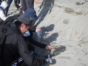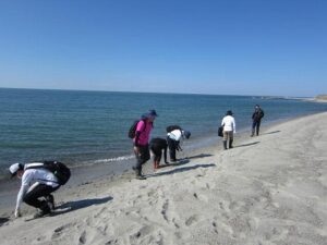 9月24日(水)、理科教育講座(自然観察)を村椿小学校で開催しました。富山県総合教育センター科学情報部の先生方から、黒部川の特徴や岩石の見分け方、身近な地域教材の生かし方等について教えていただきました。前半は市内の海岸で岩石調査や砂鉄採取を行いました。浜辺の砂の中に黒い砂鉄の層を見つけると、「こんな所に砂鉄があるとは!」と先生方からは驚きの声がたくさんあがっていました。